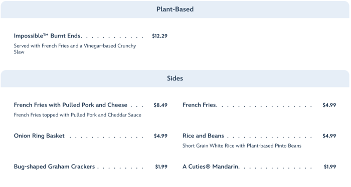 Flame Tree Barbecue also offers allergy-friendly menu options for several common allergens, but we’d recommend ordering your food with a Cast Member which will allow you an opportunity to speak to the chef and tailor your specific needs for your meal.