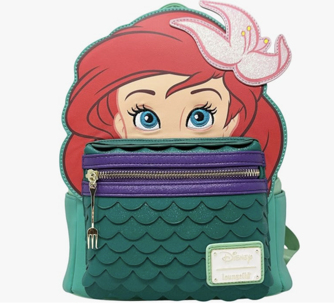 If your favorite Disney princess is Ariel from The Little Mermaid, this bag was MADE for you. Ariel is peeking out from behind a scale-patterned front pocket, and she has a beautiful flower in her hair. Our favorite part, though, has to be that fork *ahem* dinglehopper zipper pull!