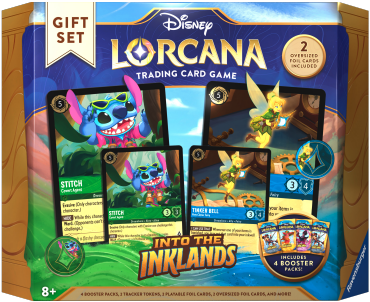 A gift set includes foil cards of Tinker Bell and Stitch, thirty-two damage counters, four booster packs of 12 game cards, and two tracker tokens with Stitch and Tinker Bell art. It would be a great gift for someone who already enjoys Lorcana!