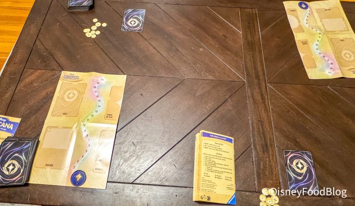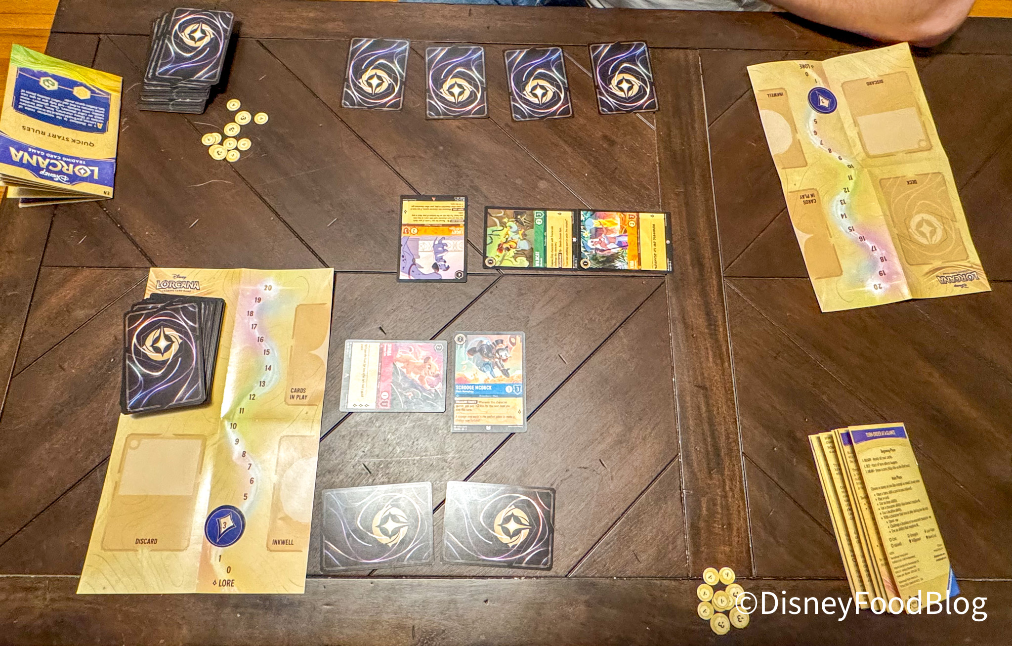 Lorcana can be played with two or more people. We’ve heard from other players that it’s more fun with a group. If you play with a group, be sure to pay close attention to your opponent’s cards! The game requires a fairly large space to be able to play since you end up laying down a lot of cards in your inkwell and those in play.