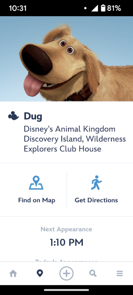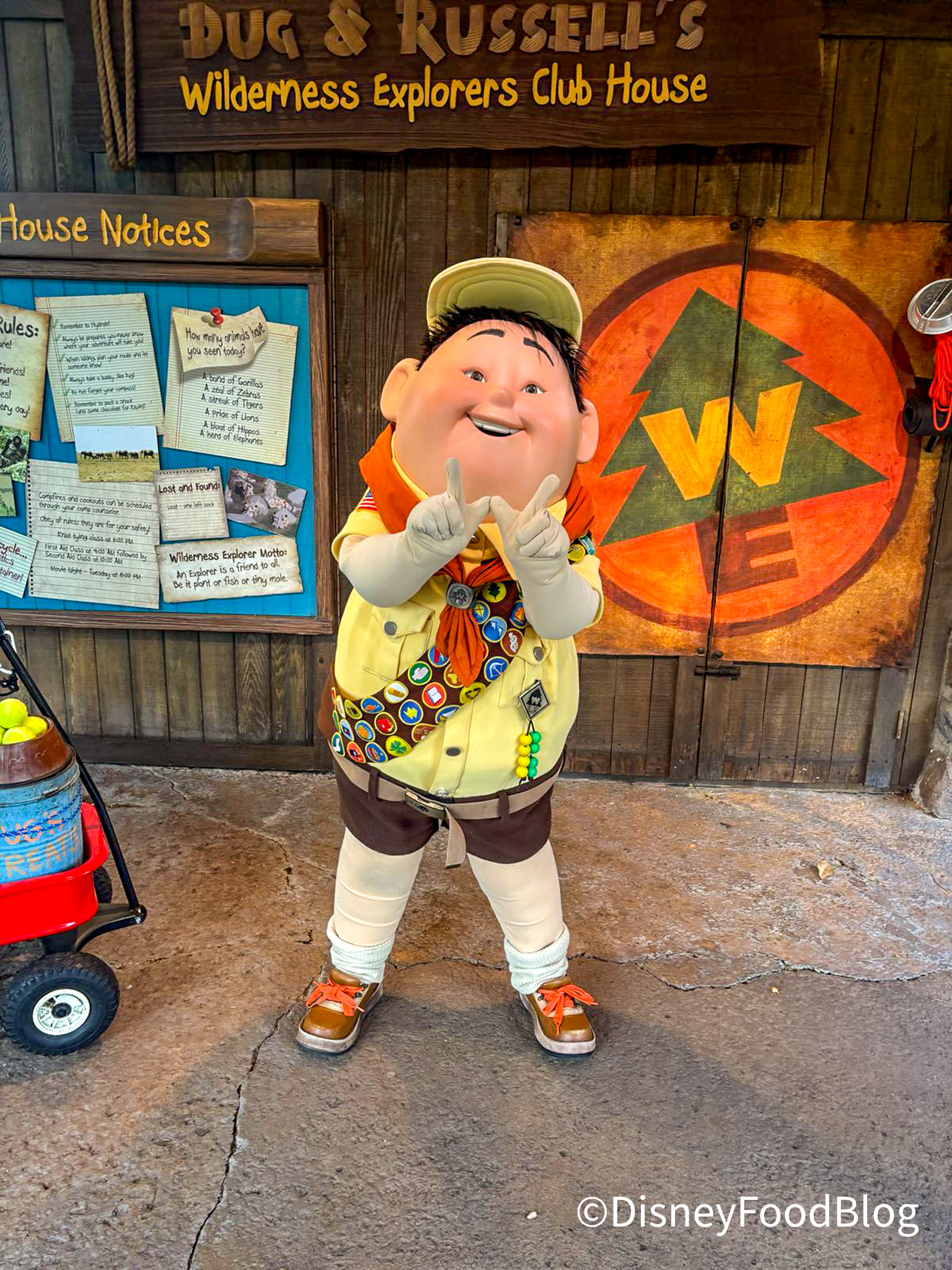 But Russell isn’t the ONLY Up character who has returned to meet guests at Animal Kingdom. Our favorite talking dog, Dug, is also meeting guests in that same location. Now, we didn’t get a chance to see Dug, but you can find out what time he and Russell meet guests on the My Disney Experience app.