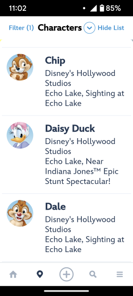 To find characters, along with their meeting times and locations, on the My Disney Experience app, you’ll want to click on the location icon at the very bottom of the screen (next to the Home icon). Choose “Characters” from the dropdown at the top and you’ll see a map of where all the characters meet. You can click on “Show List” to get a complete list. You can also use the “Filter” feature to choose which park you’re looking at.