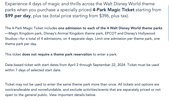 These tickets start at $99 per day — so, the total for all 4 days starts at $396, which is some GREAT savings! However, those prices do not include tax and can vary depending on the dates you select, so be sure to double-check the prices for the days you want to go!