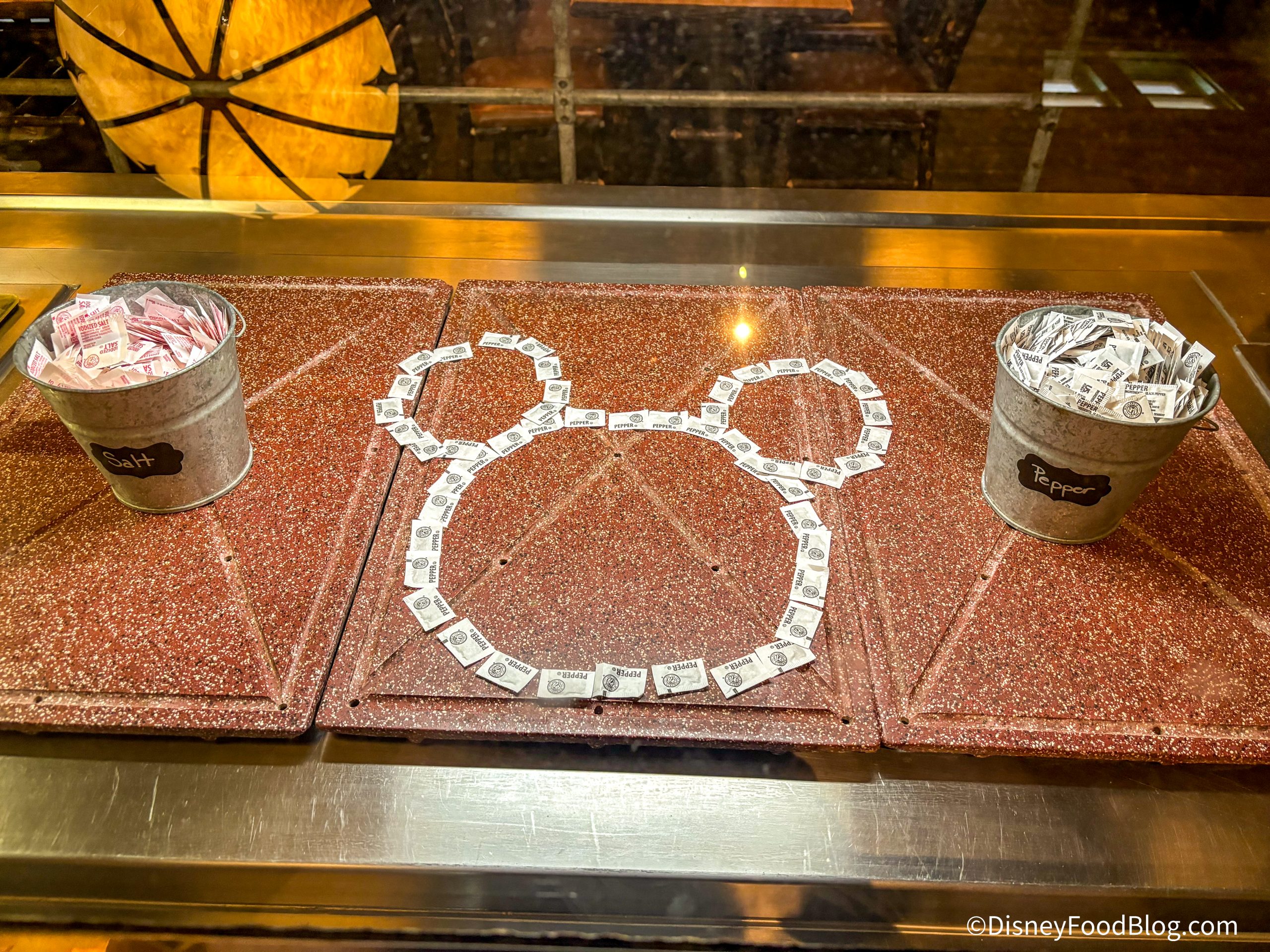 You never know when you might find Mickey, so keep your eyes peeled! We spotted a pepper packet Mickey by the condiments.