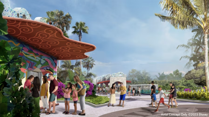 Disney shared a look at one of the tram stops as well. This space will soon be decked out in colorful decor inspired by the warmth of Bahamian art and culture. Here, you’ll find spots for hair braiding, merchandise, and more.