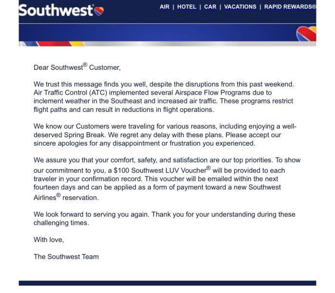 If you were involved in the delays over the weekend, you should be on the lookout for an email from Southwest! The email backs up what the flight attendants told the passengers over the weekend — weather had caused delays which backed up air traffic. To remedy the situation, Southwest sent passengers a $100 Southwest LUV voucher!