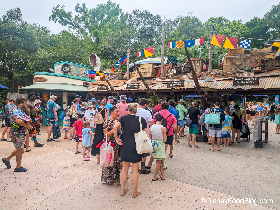 Typhoon Lagoon reopened today, March 17th — on this day, the hours for Typhoon Lagoon are from 10AM to 5PM. We showed up right at opening and there was already a line of people waiting to get in (don’t worry — this is NOTHING like the lines we see at the theme parks!).