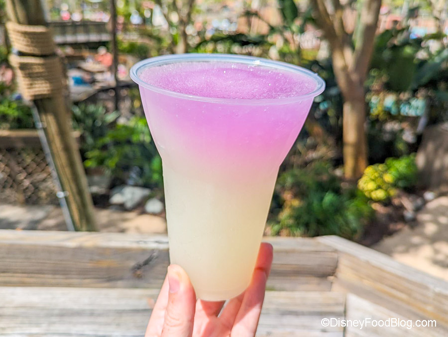 Of course, you know what we’re really here for are the snacks, right? So we headed on over to Typhoon Tilly’s to get the Dole Whip Bathtub Sundae. It’s definitely SOMETHING. It’s made with Dole Whip Pineapple, Dole Whip Strawberry, and Green Matcha Tea Soft-Serve.