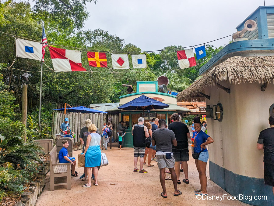 You’ll see all kinds of Imagineering details as soon as you enter the main gate. Look up in the trees and you’ll see maritime alphabet flags with secret messages. This one says “Piranha in pool!” 😨 But hey, we’re sure it’s just FINE…