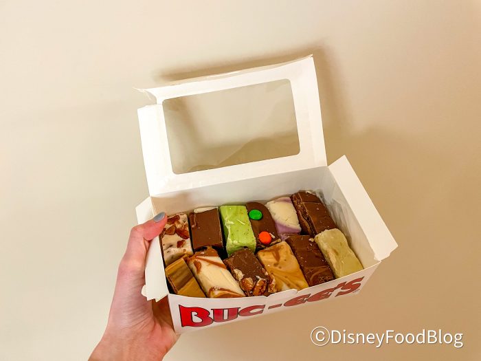 Now, it’s time to talk DESSERTS! First up, we tried the Assorted Fudge, which comes in a box of 12 pieces for $15.12. The flavors of the fudge aren’t aren’t listed on the box (or they weren’t listed on ours) so it’s really a surprise!