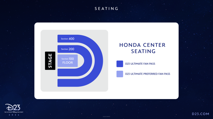 - The D23 Preferred Ultimate Fan Pass 3-Day Ticket (exclusive to D23 Gold Members): a 3-day floor seat for evening shows at the Honda Center, and 3-day access to all experiences at the Anaheim Convention Center—starting at $999/ticket.