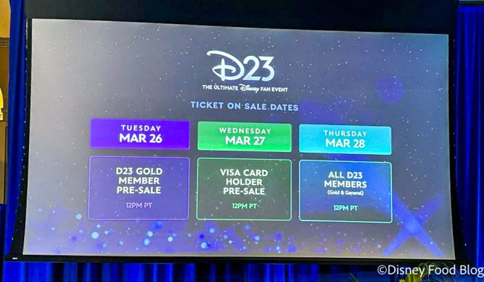 D23 Gold Members get first access to a limited number of 1-day and 3-day tickets, beginning on March 26th, 2024, at 12PM PST. D23 Gold and General Members who are Visa Cardmembers (and pay for their tickets with their Visa) get pre-sale acces to a limited number of 1-day and 3-day tickets beginning March 27th, 2024, at 12PM PST. Tickets for all D23 Gold and General Members go on sale starting March 28th, 2024, at 12PM PST.
