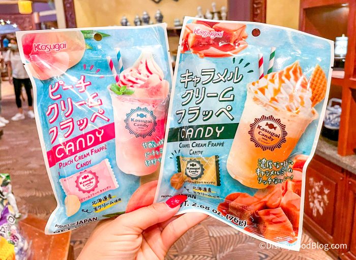 If you want to try something really new, head on over to the China Pavilion, where we found these Caramel Cream and Peach Creme Frappé Candies.