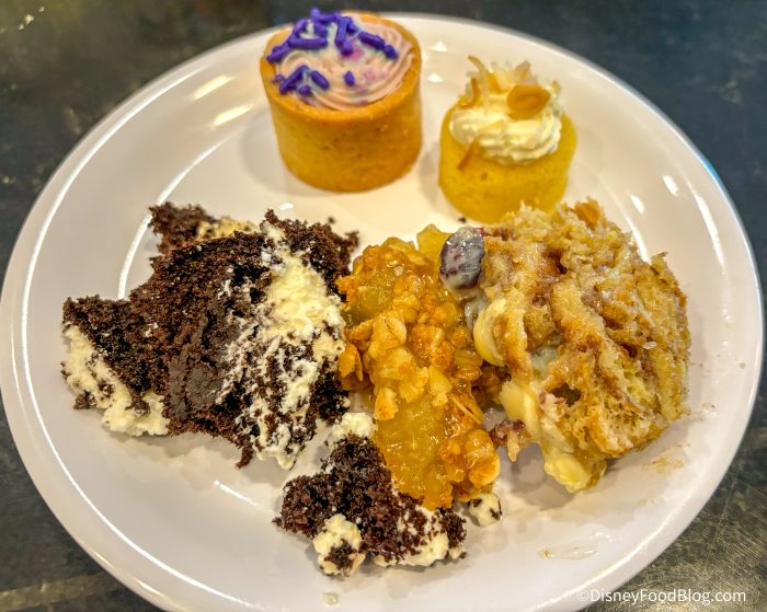 We also grabbed some samples of the Apple Crisp and Bread Pudding. The Apple Crisp is exactly what you would expect. It had soft, tender apples with a sweet, syrupy glaze and was topped with a crunchy, sweet oat topping. We think the Apple Crisp would be fabulous alongside some vanilla ice cream. The Bread Pudding was a bit disappointing. The combination of raisins and white chocolate actually worked really well, but the bread pudding was really dense and kind of hard to eat. The vanilla sauce on top helped a bit with the denseness, but we think there are a lot better places to get bread pudding at Disney World. (We’re looking at you, Banana Cabana!)