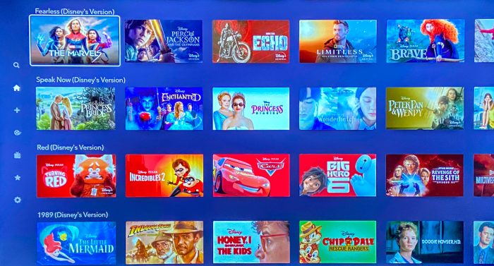 Oh, and in case you missed it, we have to show off one of our FAVORITE parts of the premiere. Disney+ got a little Taylor Swift makeover for one night only, with an interface full of references to Taylor Swift eras. We especially liked Fearless (Disney’s Version).