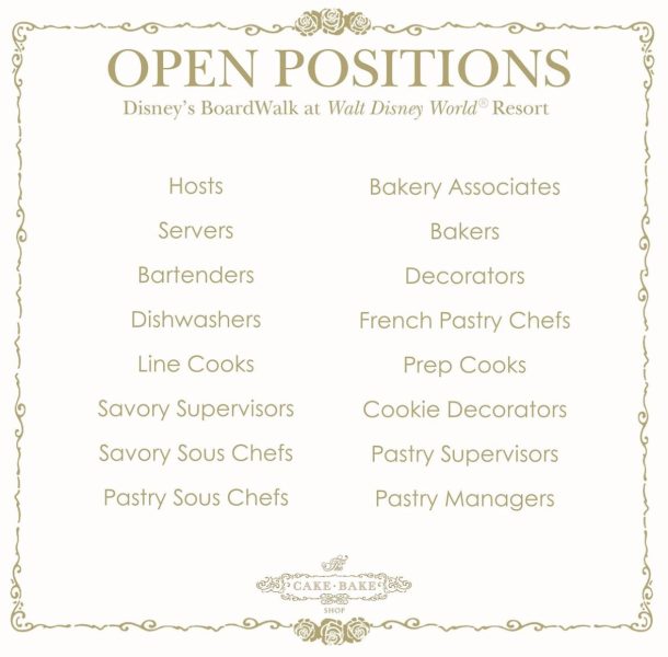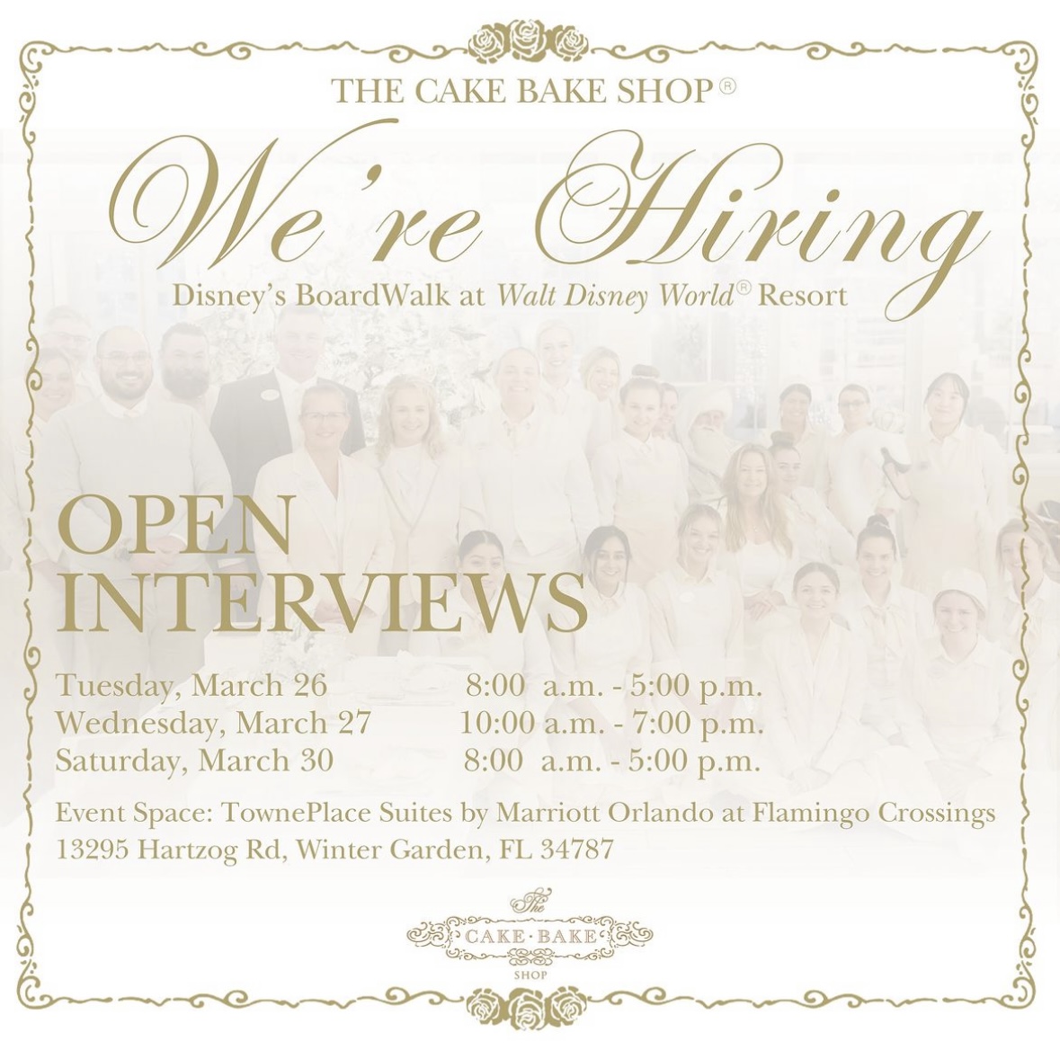 While we have previously written about the location hiring for both Executive Chefs and Sous Chefs, the restaurant is taking another huge step towards finally opening! The Cake Bake Shop recently shared a post on Instagram that states they are HIRING for the Walt Disney World location. We are SO excited! They are hiring for a variety of positions and will be hosting open interviews beginning March 26th, 2024. The open interviews will take place at the TownePlace Suites by Marriott Orlando at Flamingo Crossings.