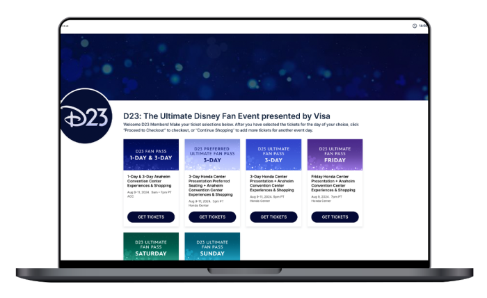 - D23 Preferred Ultimate Fan Pass 3-Day Ticket, exclusive to D23 Gold Members, includes a 3-day floor seat for evening shows at the Honda Center (same seat each night), and 3-day access to all experiences at the Anaheim Convention Center—starting at $999.