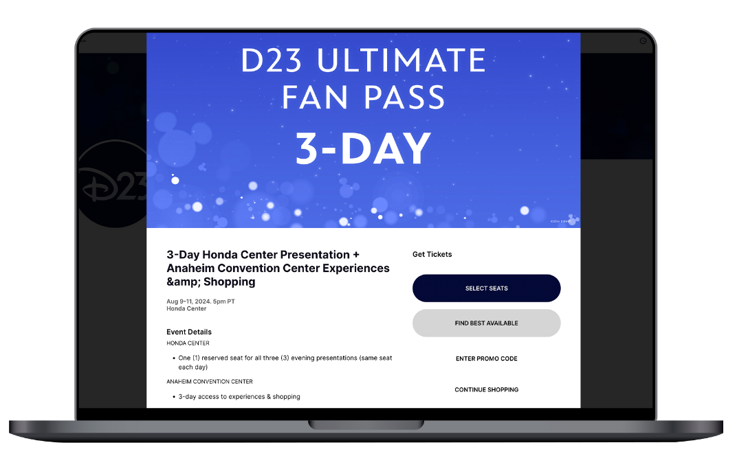 - D23 Ultimate Fan Pass 3-Day Ticket includes a 3-day assigned seat for evening shows at the Honda Center and 3-day access to all experiences at the Anaheim Convention Center—starting at $297.