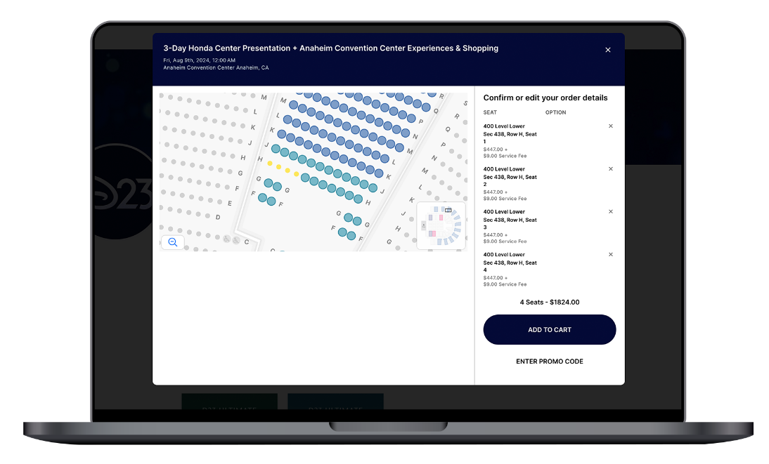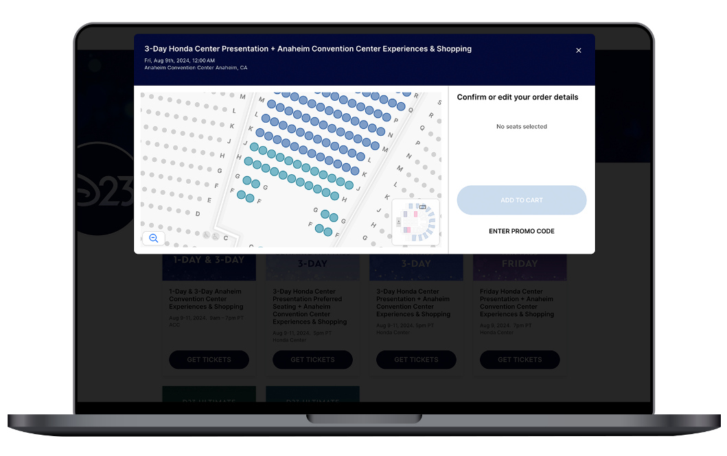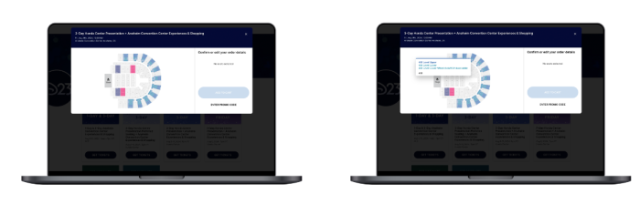 Step 4: Now that you have selected your ticket option, you will be taken to a screen with more information and the option to select your seats. If you have been to a D23 Expo before, you will notice that ticketing is a bit different this year. The biggest and most popular panels with be held in the evenings at the Honda Center. You will be selecting your seats for these panels ahead of time, and your ticket price will vary depending on the seats you select. This will be a change from waiting in long lines to get a seat at the panels!