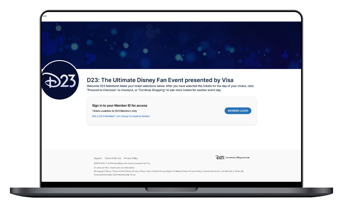 Step 1: Login into your D23 Membership account. You will need to be a D23 member in order to purchase tickets! However, you can sign up for a free membership right here to get access to ticket sales.