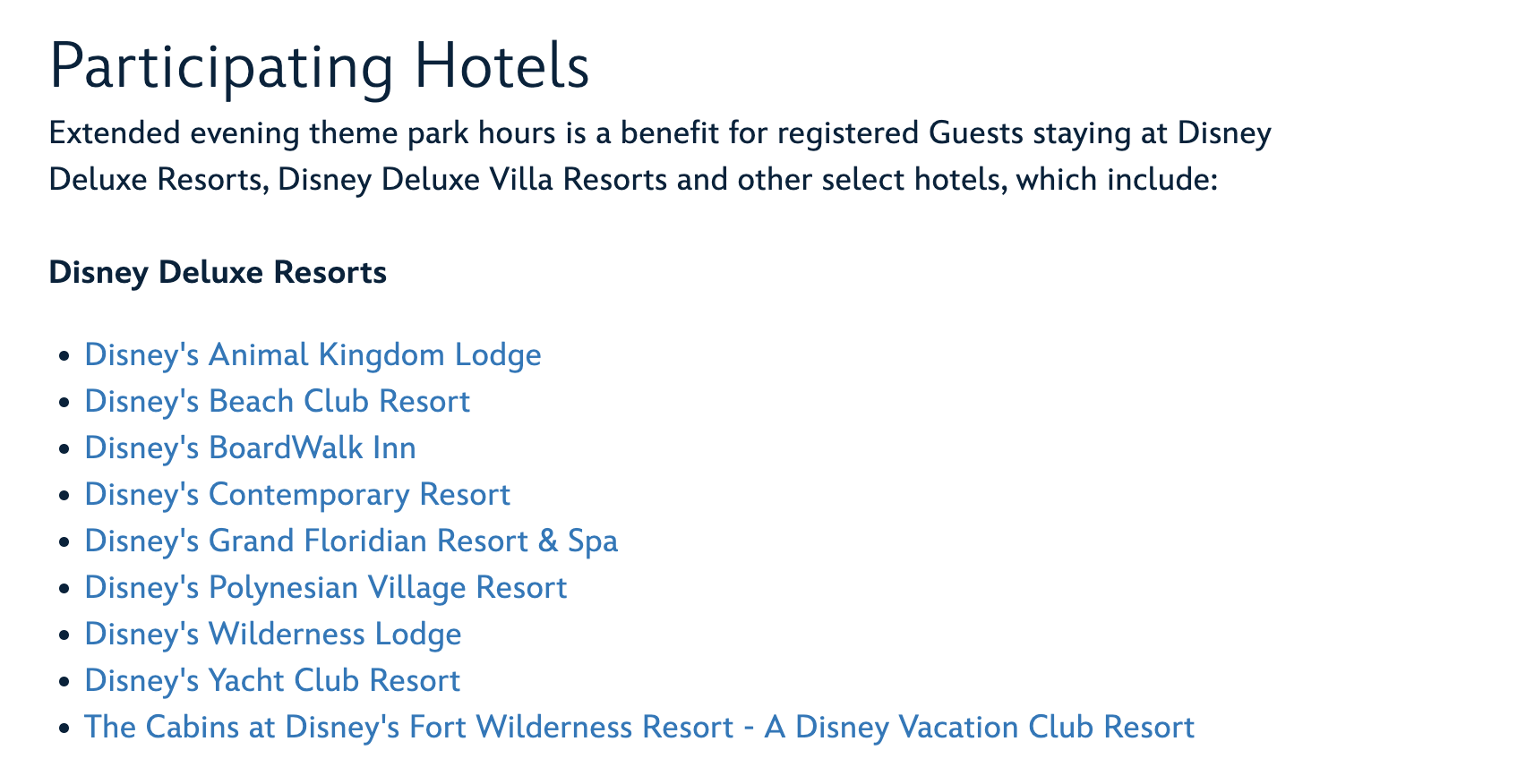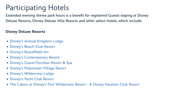 Thanks to a DFB reader, we were notified about this Extended Evening Hours qualifying hotels change, and got very excited! It’s great to see that more guests will have the opportunity to stay in the parks after regular hours. You can see the list of Deluxe Resorts that can currently receive this perk. The Cabins at Fort Wilderness as the DVC cabins will have access in the late evenings.