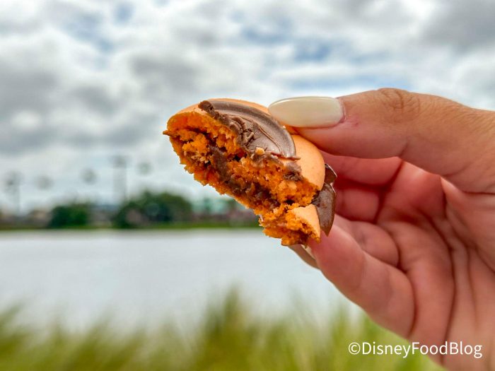 Last, the orange-milk chocolate macaron! It was topped with a chocolate Riviera “R” medallion, which was a nice addition when it melted a bit and added to the gooeyness of the cookies. The overall flavor reminded us of an orange-chocolate candy, and we really enjoyed it! It was probably our favorite of the three.