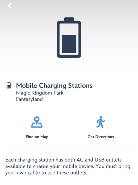 Did you know that you can find charging stations on the Disney World app? Just go to the search button, type in “Mobile Charging Stations,” and this page should pop up!