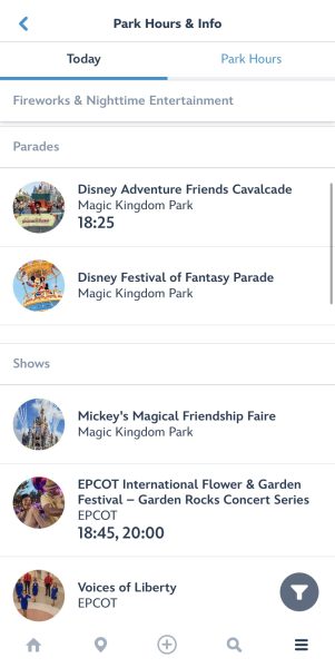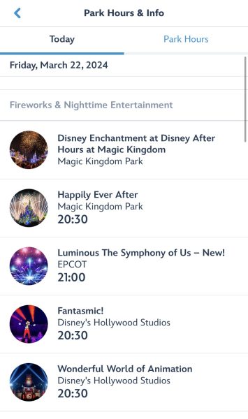 You can click on that section to see more details about what’s happening today in Disney World, including a list of nighttime entertainment like fireworks shows and Fantasmic!