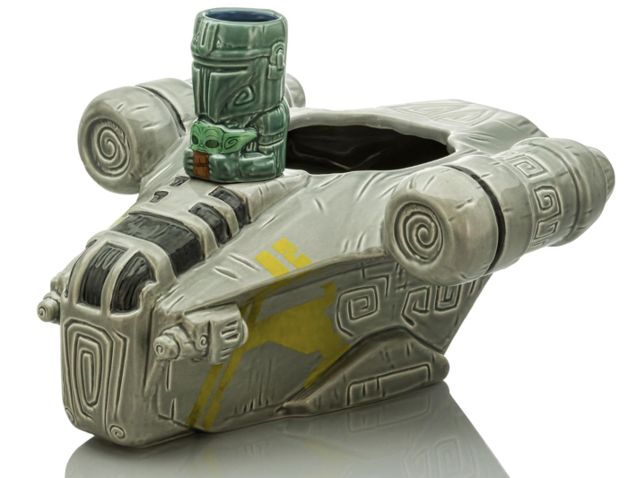 The bowl is shaped like the Razor Crest and holds 55 ounces of your drink, while the muglet holds about 2 ounces. Look carefully at that little mug and you’ll see that Mando is holding Grogu!