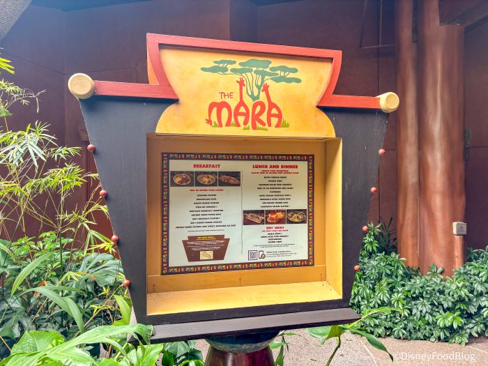 However, we are not here to search for animals, but instead, we are here to try out a new Easter treat! We are making our way to the quick service restaurant located in the Jambo House at Animal Kingdom Lodge. The Mara is located overlooking the Uzima Springs pool area and is open for breakfast, lunch, and dinner. You can grab a wide variety of eats, drinks, and snacks here. The menu features items with a taste of Africa, as well as American favorites.