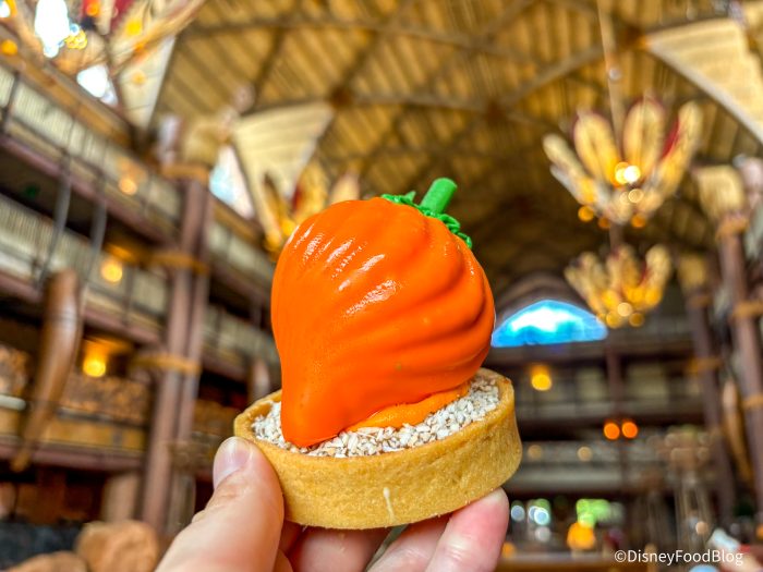 Of course, we had to take this treat around the resort for a couple of photos before digging in. The tart is shaped like a carrot, which is perched on top of the carrot cake bottom. Oh, and the orange part? It’s a chocolate SHELL!
