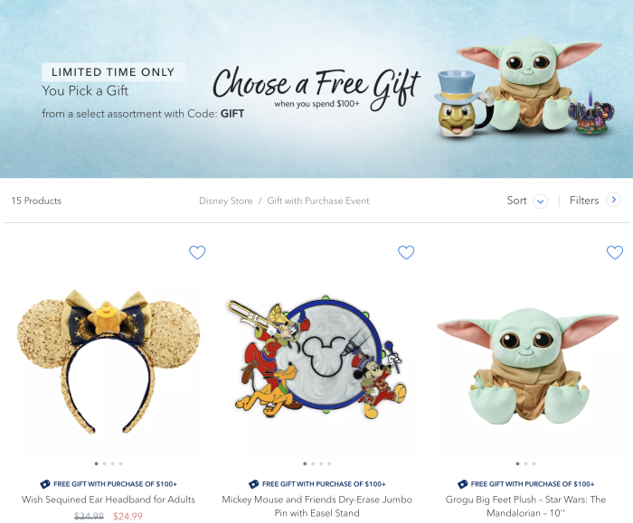 Right now, when you Spend Over $100 on Disney Store merchandise, you’ll get to choose a free gift! There are 15 different gifts to choose from, and they range from ears, to plushes, to ornaments, and more.