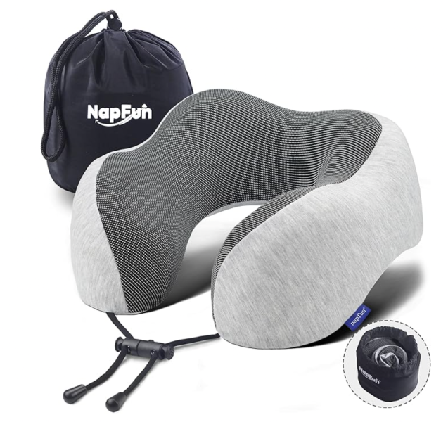 It can be hard to get comfortable on a plane. This napfun Neck Pillow is a great solution to help you rest while you travel. It is a memory foam pillow and even rolls to save space! It also features a space to place your chin so you can sleep more comfortably.