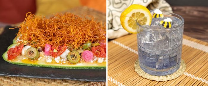 - Zucchini Carpaccio: “The Land” zucchini, marinated tomatoes, candied pistachios, castelvetrano olives, golden raisins, plant-based feta, pomegranate molasses, and crispy sweet potato (Plant-based) (New)