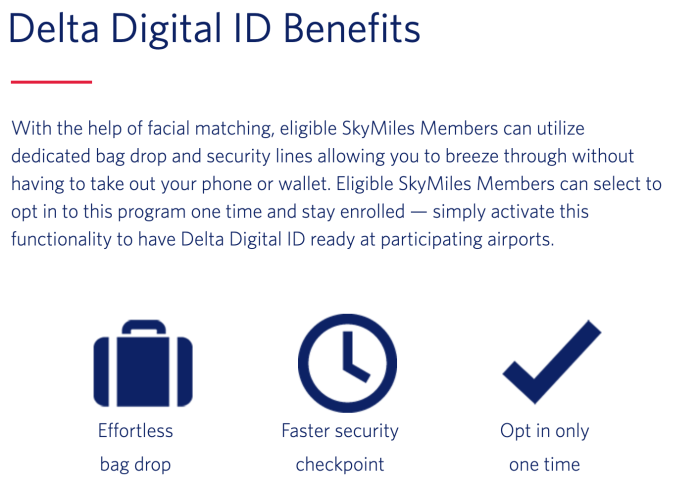 OK, so here’s how it works. Delta Digital ID uses “facial matching” to allow members to use dedicated bag drops and security lines, “allowing you to breeze through without having to take out your phone or wallet.” That’s right — imagine a world where you don’t even need your phone or wallet at the airport. Now THAT’S the future.