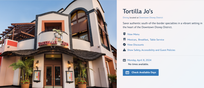 On the Disneyland website, Tortilla Jo’s is still showing hours for April 7th (Breakfast from 8AM to 11AM, lunch from 11:05AM to 3:55PM, and dinner from 4PM to 10PM)…