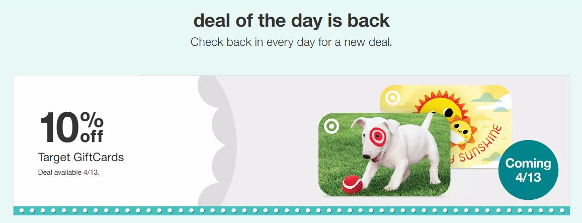 In addition to these deals, there will also be a deal of the day. Check back each day for a new deal! Target gave us a sneak peek of the deal on April 13th, which will be 10% off Target gift cards. We are excited to see what other deals they offer each day.