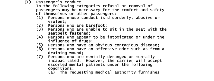 What we didn’t expect to see on this list of warranted reasons to remove passengers was DRAINING WOUNDS. Yep, it says that a person can be removed for having “an offensive odor, such as from a draining wound.”