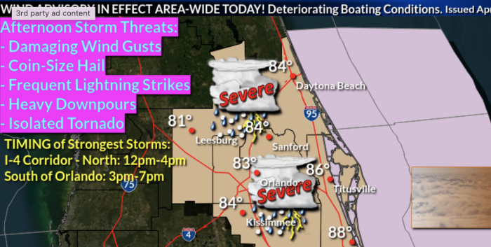 The Orlando Sentinel reports that “strong to marginally severe storms” will affect Central Florida, especially along the I-4 corridor. Yep, this includes Orlando.