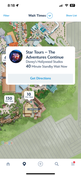 Well, those changes are available on the ride AS OF NOW, and we had a chance to see some of these new scenes. We’re also checking to see how this is affecting crowds at Hollywood Studios, as well as wait times. So here’s what Hollywood Studios looked like when we arrived this morning. Granted, we’re still dealing with Spring Break crowds, too. This is for Early Theme Park Entry, by the way.