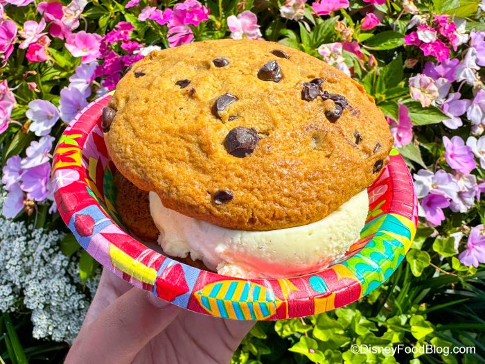 Let’s head on over to the Italy Pavilion where we’re visiting Gelateria Toscana. This is a gelato shop where we discovered a few new snacks. The first is a Cookie Sandwich, which is made with a Homemade Cookie and Vanilla Gelato for $12. The gelato is so creamy and smooth and has a great authentic vanilla flavor! The cookies also have a pretty good amount of chocolate chips inside.
