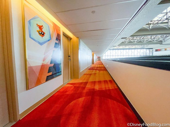You do not even have to be staying at the Contemporary to see some of these changes! When you are waiting in line for the monorail, look across the way — you can see artwork from the Incredibles outside of the rooms.
