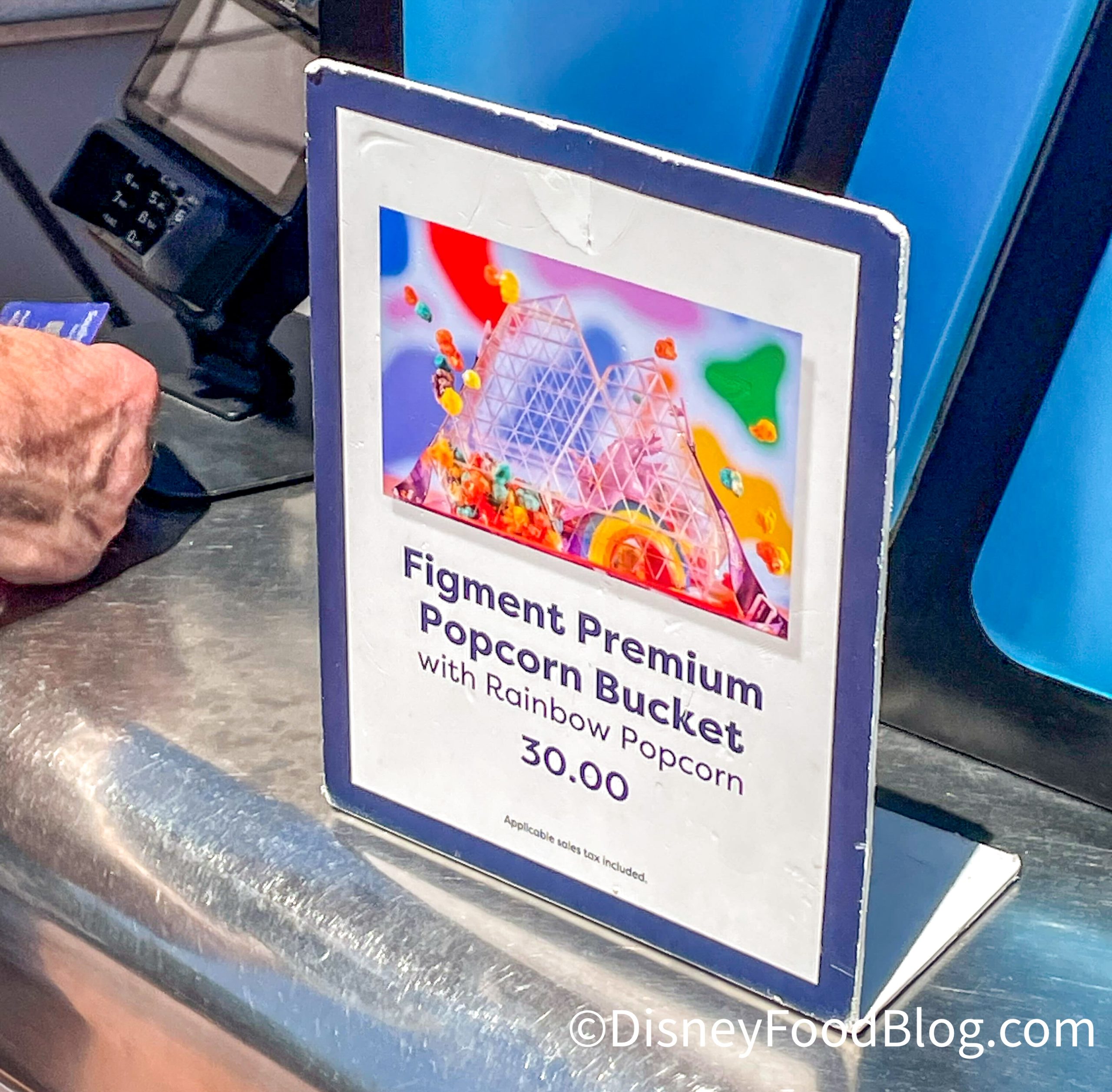 One of our team member’s families was wandering around EPCOT when they noticed a sign saying that the Figment Premium Popcorn Bucket is still for sale for $30!