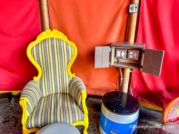 This is a place where everyone who comes by, figures it’s just a kiddie place to meet characters, splash around at Casey Jr.’s, and make a pit stop at the bathrooms. What they don’t know, though, is that there’s typically a pretty chill place to relax and charge underneath the tented area by the train exit. Shhh… this one can be our little secret, ok?