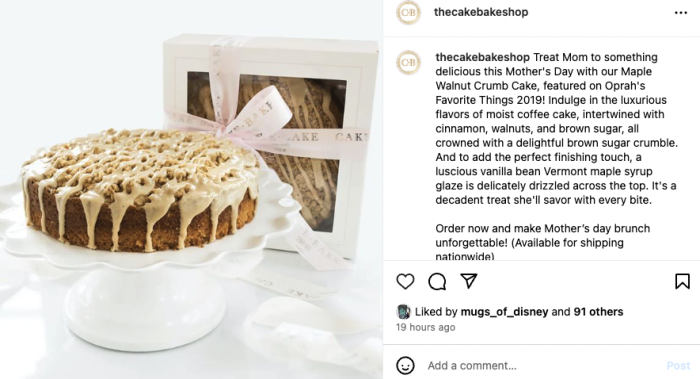 We’re not kidding! Over on Instagram, we noticed that @thecakebakeshop was advertising its Walnut Crumb Cake for Mother’s Day. Looks SO GOOD, right? Well, we saw the words “available for shipping nationwide,” and we were SOLD.
