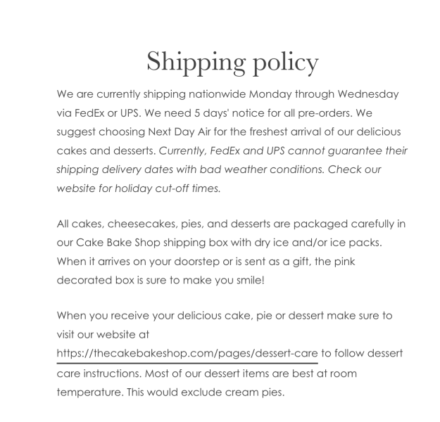 Naturally, we BOLTED over to their website, and sure enough, most of their cakes, pies, and treats are available to be shipped (those that don’t say “pick-up only” next to the listing)!