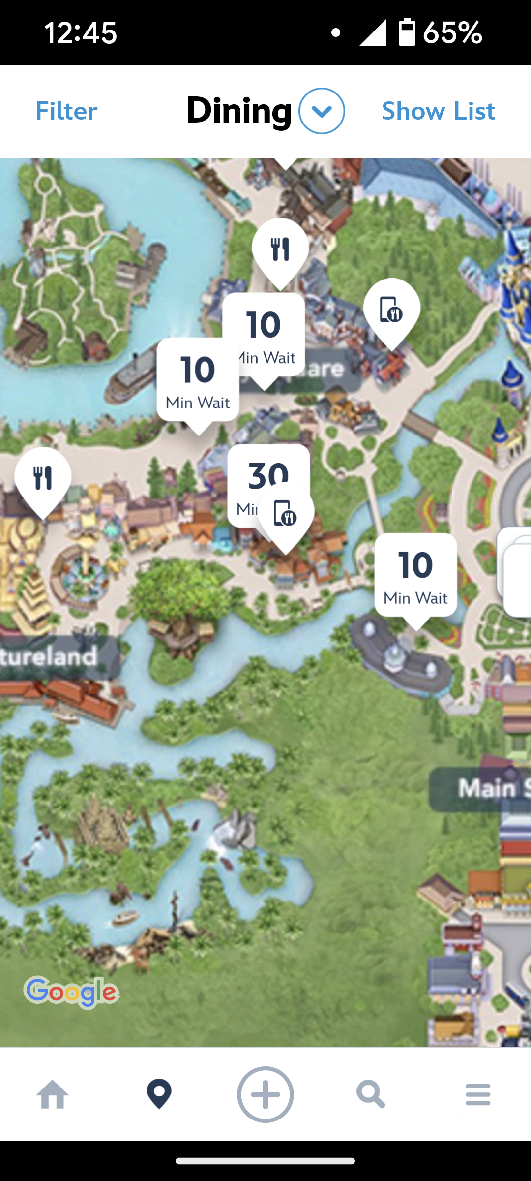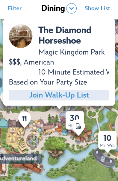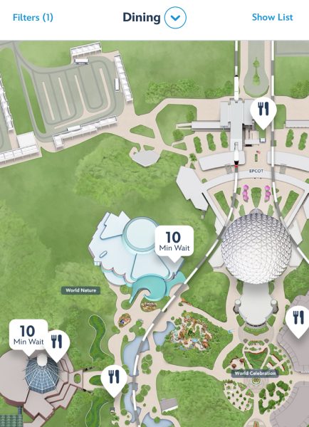 Restaurant wait times are also listed in the map view for EPCOT, Disney’s Hollywood Studios, and Disney’s Animal Kingdom.