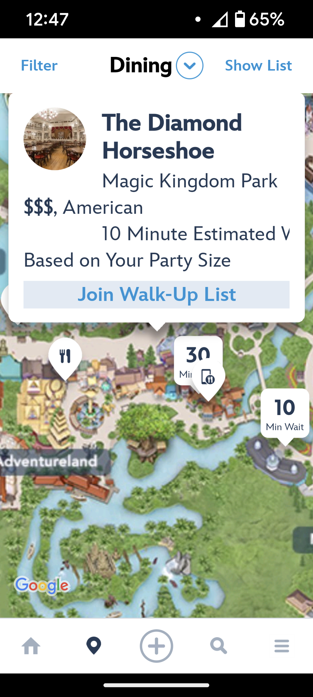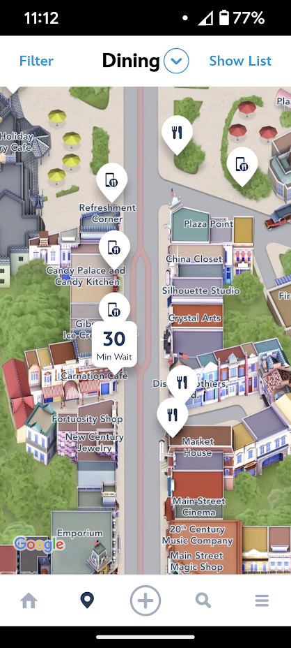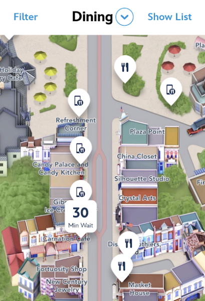 We first discovered this handy feature while using the Disneyland app. If you open the app and click on the location icon at the bottom of the screen, you’ll pull up a map of Disneyland. If you click the dropdown arrow at the top of the screen and choose Dining, you’ll get a map with all your dining options. Well, a new feature appears on this map — the wait time for table-service restaurants and lounges! So, for example, when we checked this morning, Carnation Cafe had a 30-minute wait.