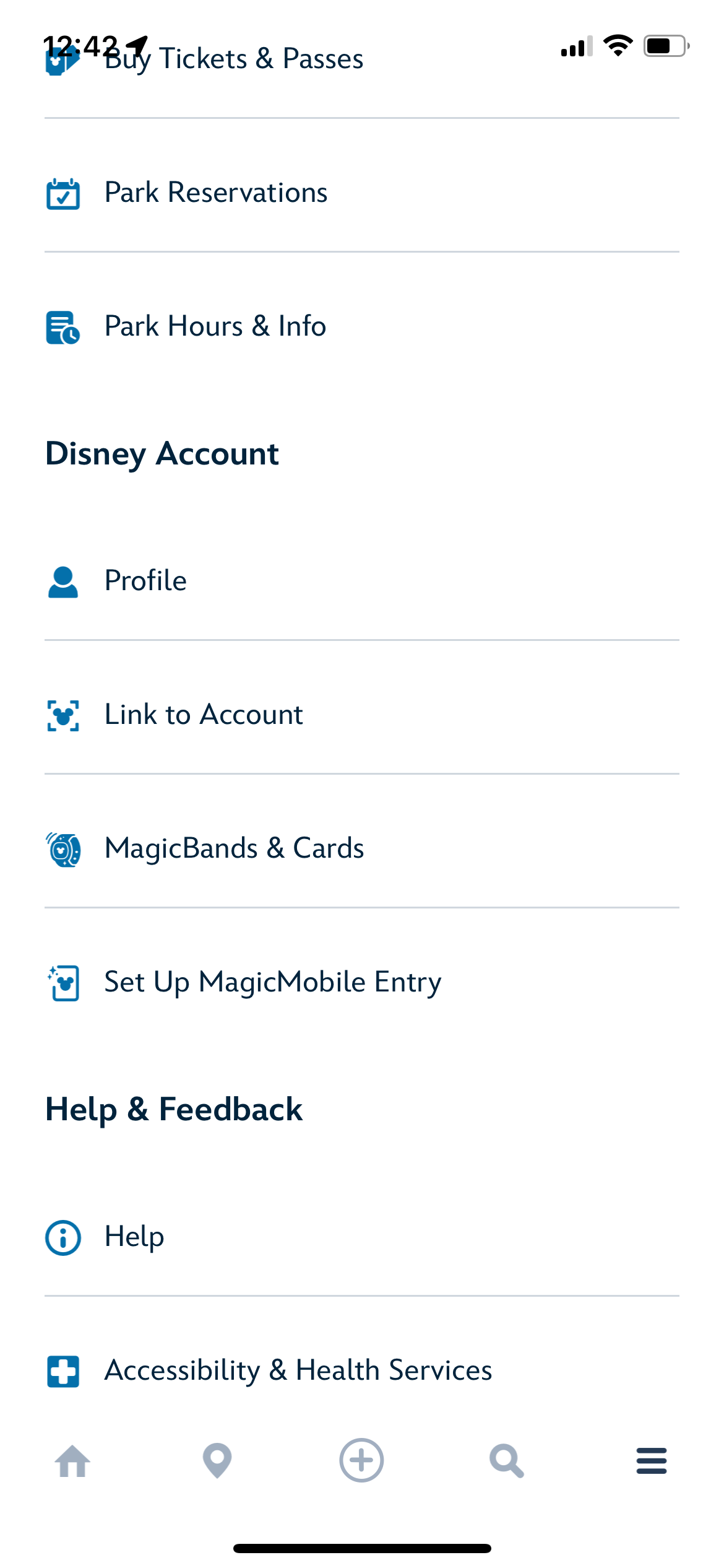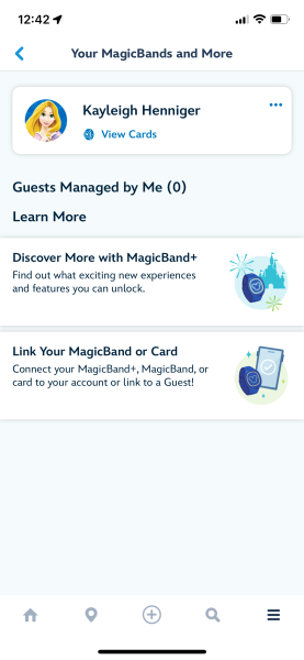 First, you’ll want to get logged in on the My Disney Experience app and head to the hamburger icon in the bottom right corner of the page. From there, you can scroll down to a spot that says “MagicBands and Cards.”