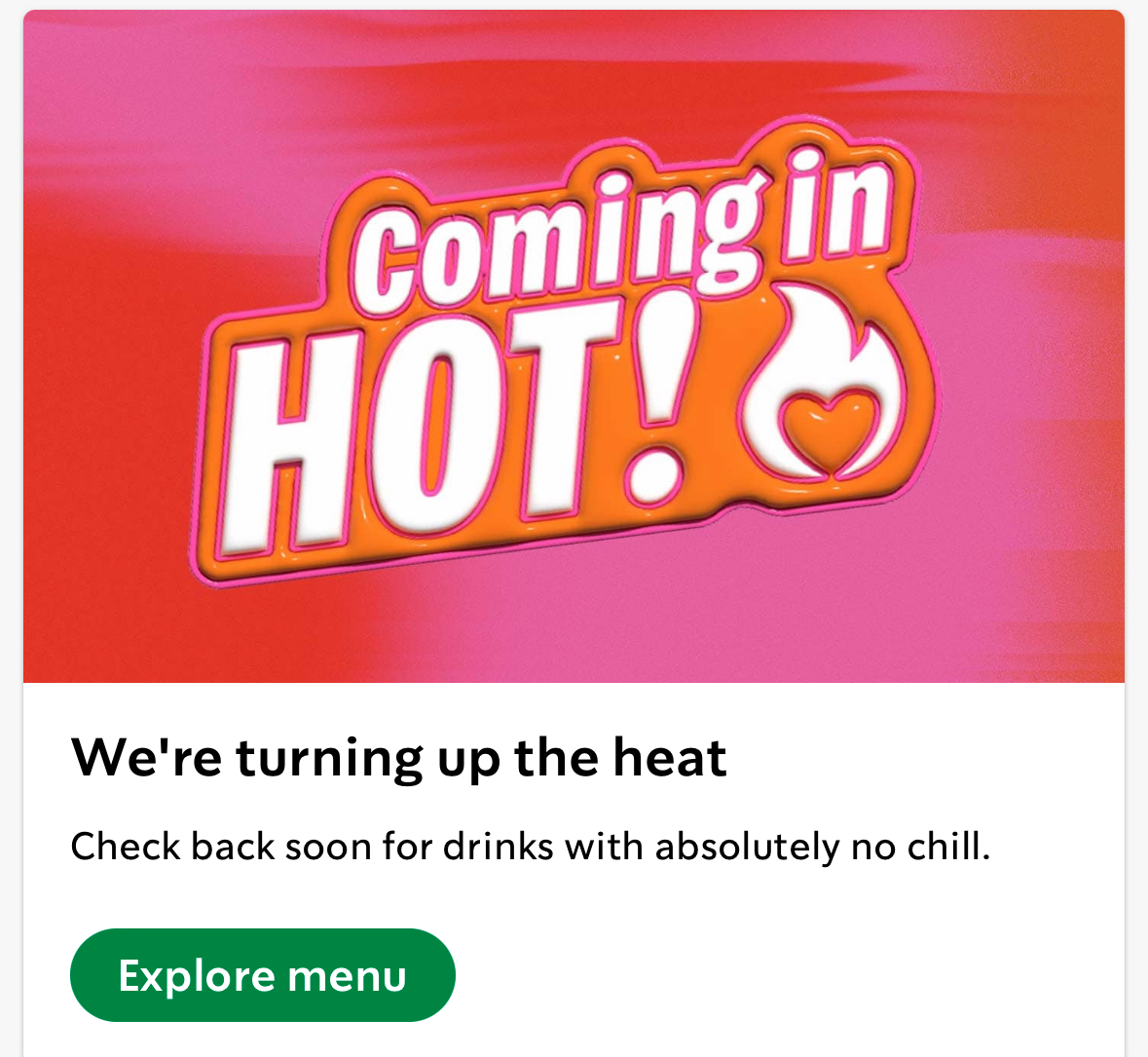 You know what that means? It means spicy drinks are coming to Starbucks! This theory is confirmed by the Starbucks app, which has a message on the home screen saying “Coming in hot!” and “Check back soon for drinks with absolutely no chill.”